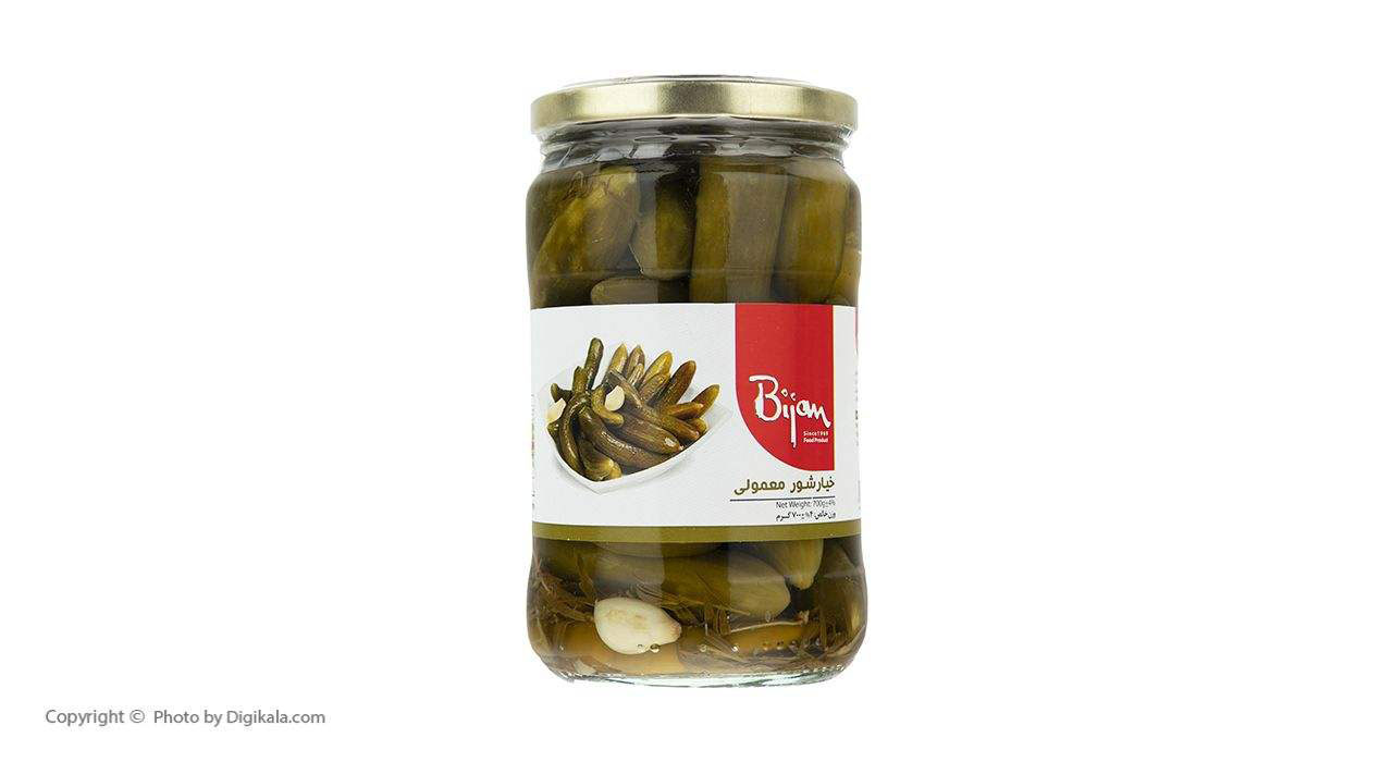 استفاده از ترشیجات و چاشنی در کنار غذا باعث افزایش اشتها می‌شود. چاشنی‌های زیادی در سفره ایرانیان قرار می‌گیرد که خیار شور یکی از پر طرفدارترین آن هاست. خیار شور کاربردهای زیادی دارد یکی از مهم ترین آن استفاده این ماده خوراکی خوشمزه در ساندویچ است. ساندویچ‌های کمی را می‌توان یافت تا از خیار شور برای مزه دار کردن آن استفاده نشود. از خیار شور برای تزئین و دورچین غذا هم استفاده می‌شود. طعم خاص و دل‌چسب خیار شور باعث می‌شود تا از قرار گرفتن آن در کنار هر غذایی لذت خوردن آن غذا چند برابر شود. محصولی که مشاهده می‌کنید خیار شور معمولی بیژن با مقدار ۶۸۰ گرم است که عطر و طعم خوب باعث شده تا آن را به یک چاشنی پرطرفدار تبدیل کند.